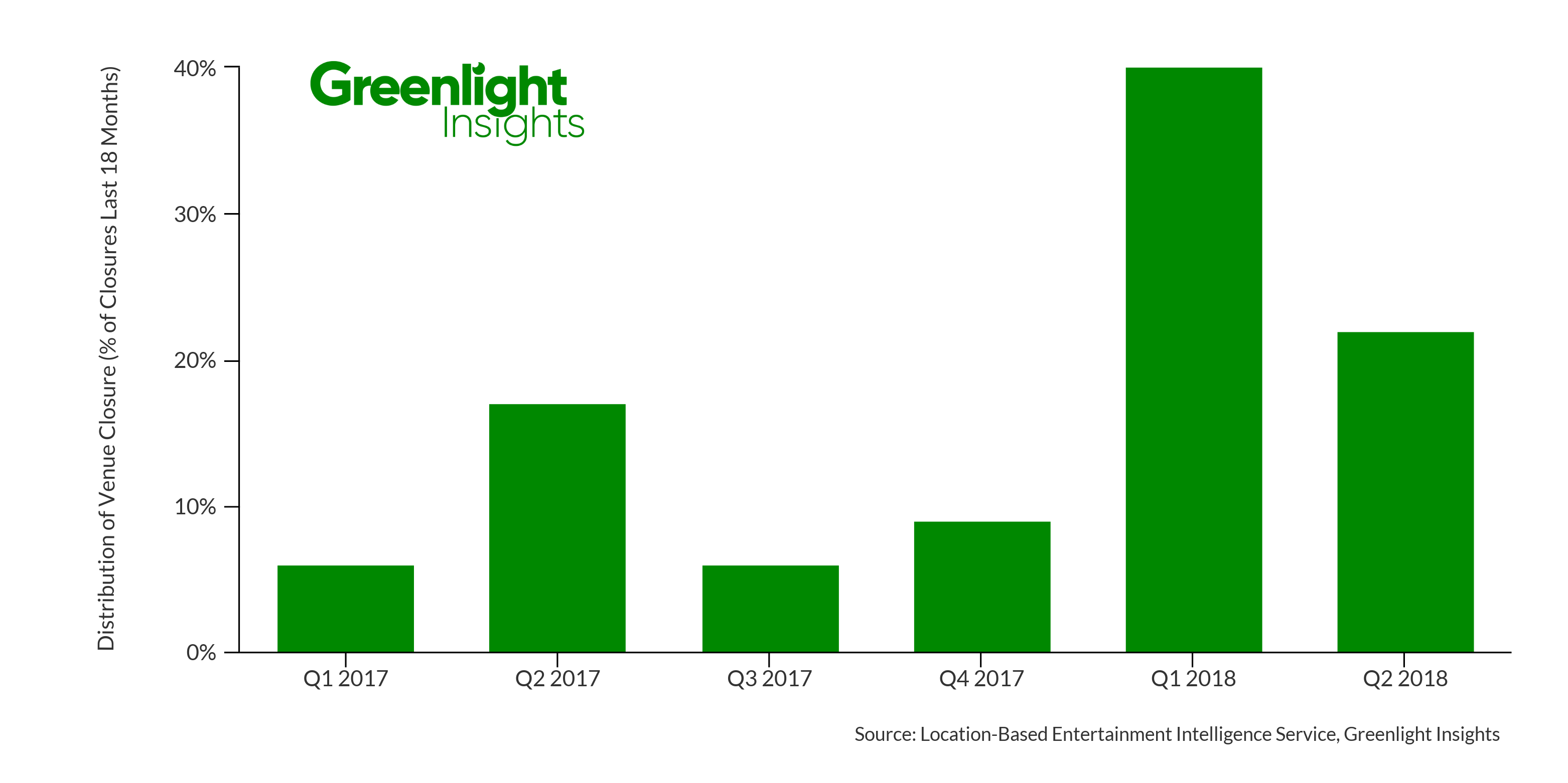 Based on Greenlight Insights' Location-Based VR Tracker - a panel of over 400 entertainment venues worldwide with VR system deployments, 6% of locations opened in 2017, closed in the first six months of 2018.